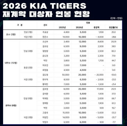 KIA는 2026 시즌 연봉 재계약을 완료하였으며, 48명의 재계약 대상자 중 25명이 인상, 7명이 동결, 그리고 16명이 삭감을 받았습니다. 이렇게 많은 수의 선수들이 각각 다른 연봉 변동을 겪는 이유는 팀의 성적과 선수들의 개인 성적이 밀접하게 연관되어 있기 때문입니다. 특히, 성영탁 선수는 3000만원에서 300% 인상된 1억2000만원에 계약하며 팀 내 최고 인상률을 기록했습니다.
